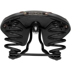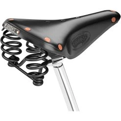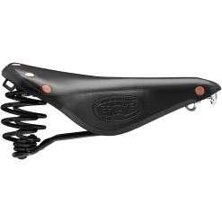 The is a touring saddle with spring suspension for comfort and hand hammered rivets for durability. It has the same leather top as the B17 model, but with added suspension and hand-hammered copper rivets that protect the leather over time. One of our most popular models, the Flyer is handmade in our Smethwick, England factory and features a durable black powder-coated frame.